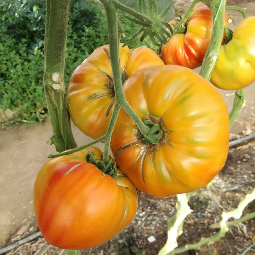Old German is een fantastisch vleestomatenras met vruchten van rond de 300 gram. Het uiterlijk van de vruchten is wat dof geel met rood en scheuren bovenop. Niet de allermooiste tomaat, maar als je hem doorsnijdt wordt je verrast door een spectaculair kleurspel van warm geel met fel rode vlekken erin. De smaak is echt voortreffelijk, volzoet en sappig. Niet voor niets werd Old German winnaar van het "Brussels Tomato Festival", in 2016.